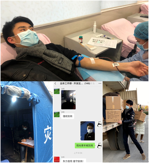 赵栋镭还第一时间加入到社区疫情防控一线,并主动认领工作任务。一边是挺立于社区防疫一线,值班值守,志愿服务,日日披星戴月;一边是坚守于单位工作岗位,后勤保障、材料报告,件件尽心尽力。“可这些还不够,一定还能做些什么?”他不停问自己,总想着发挥自己的未尽能量。当他看到志愿突击队搬运防疫物资的消息,便在社区执勤结束后第一时间赶去搬卸物资。看到市中心血站血库告急的消息,他又第一时间冒着雨雪赶过去献血。