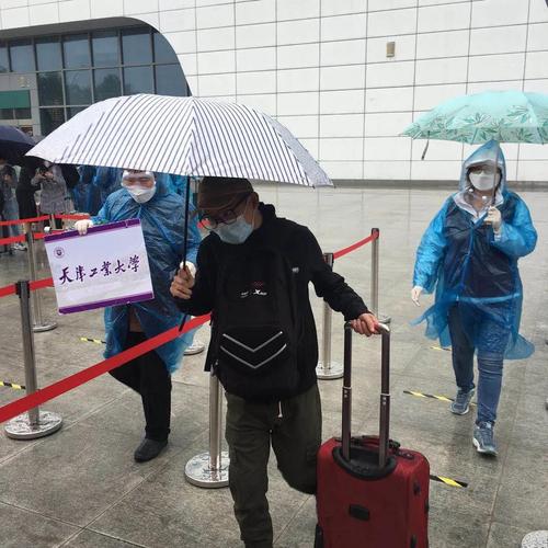 核验身份、测体温、扫码,工作人员热情引导返校学生依次完成每个步骤和程序。进入学生公寓前,同学们再次完成“一消二看三测”流程,即行李消毒、查看天津“健康码”、测即时体温,均无异常方可进入宿舍。