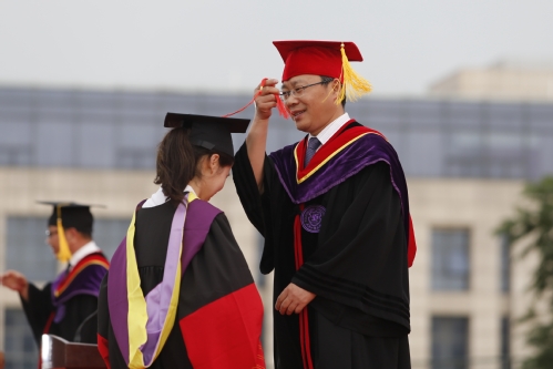 伴随着《拉德斯基进行曲》,学位授予仪式正式开始。身着学位服的毕业生代表坚定地走上主席台,校学位评定委员会主席、校长夏长亮院士和党委书记俞绍平为毕业生代表“拨穗正冠”,授予学位,并合影留念。