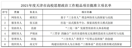 近日,市委教育工委市教委公布了2020年度天津市高校思想政治工作精品项目结项及2021年度天津市高校思想政治工作精品项目立项名单。我校承担的2020年度6个项目顺利结项,其中校党委副书记胡英江主持的《区校课外活动一体化建设》和党委常委、党委组织部部长刘宏韬主持的《开云网页版“铸魂固本工程”育人平台建设研究》2个项目获得优秀,其他4个项目为合格。在2021年批准立项的40项项目中,我校成功获批6项,居天津市高校前列。
