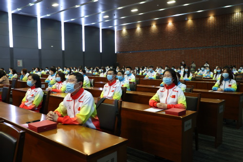 大会在雄壮的国歌声中拉开序幕。全体参会人员肃然而立,目光坚定,高唱国歌。