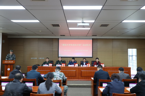 2021年4月16日上午,我校“退役大学生成长计划”(以下简称“成长计划”)启动仪式在会议中心第七会议室举行。天津市人民政府征兵办公室主任、天津警备区动员局局长宋乃宏,我校党委副书记胡英江,河东区人民武装部政委王卫东、副部长杨雪勇,河东区退役军人事务局局长苏梅出席活动。警备区动员局、河东区人民武装部、河东区退役军人事务局,学校相关职能部门负责同志、各学院相关同志以及全体退役大学生参加活动。仪式由我校人民武装部部长张志勇主持。