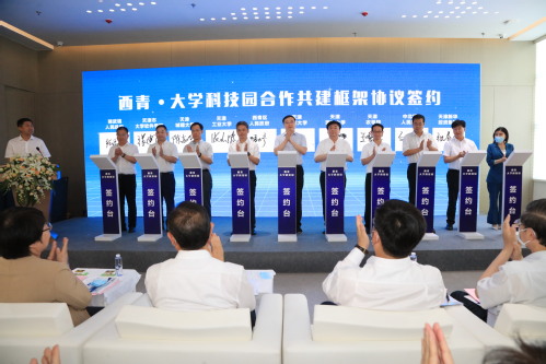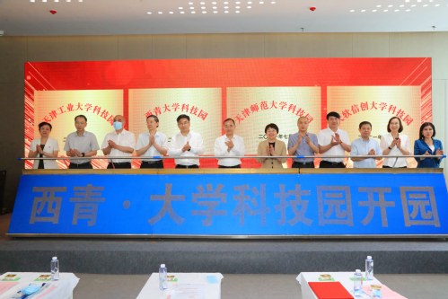 活动中,市领导与西青区领导、学校领导共同为开云网页版科技园、天津师范大学科技园、西青区大学科技园、天软信创大学科技园揭牌,并见证五所高校与西青区人民政府签署合作共建框架协议。