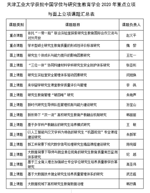 近日,中国学位与研究生教育学会发布了《学会2020年面上课题立项通知》,我校14项课题获面上立项,赵义平教授申报的《依托“一带一路”联合实验室探索研究生教育国际合作交流与对外开放》、魏黎副教授申报的《学术型硕士研究生教育质量的形成性评价标准研究》两项课题获重点立项。我校立项总数位居全国高校前列,天津市高校第一,为历年来最好成绩。
