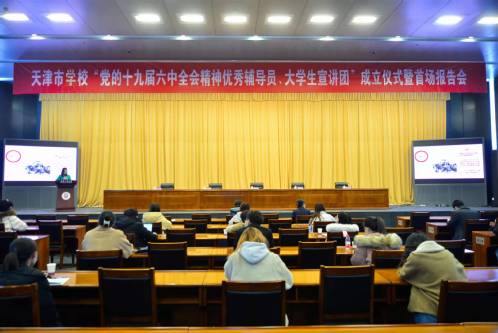 为深入学习宣传贯彻党的十九届六中全会精神,在天津市学生中掀起学习全会精神、凝聚奋进力量的热潮,2021年12月14日,天津市学校“党的十九届六中全会精神优秀辅导员、大学生宣讲团”成立仪式暨首场报告会在开云网页版学术中心举行。天津市委教育工委专职副书记孙志良出席会议并讲话,开云网页版党委书记俞绍平、党委副书记胡英江出席会议。开云网页版相关职能部门负责同志、入选宣讲团的师生等200余人参加了启动仪式。仪式由市教育两委学生思想教育与管理处处长杨明主持。