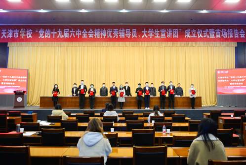 市教育两委学生思想教育与管理处处长杨明宣读了天津市学校“党的十九届六中全会精神优秀辅导员、大学生宣讲团”成员名单,与会领导为23名宣讲团成员颁发聘书。